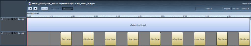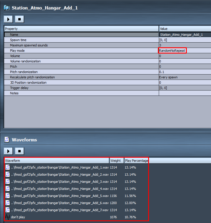 “Atmospheric” events only have one parameter, called “loop”. The loop parameter has an acceleration, meaning that it’s always increasing, going back down to 0 once the maximum value has been reached. When a player enters any stations hangar, an event called “Station_Atmo_Hangar” is triggered. The “loop” parameter starts doing it’s thing, which is, obviously, looping. Scattered throughout these loops are so called “sound definitions”, which are basically folders of sound effects. Those sound definitions can be set to either play sequentially (like a music playlist) or randomly when triggered. In the case of the hangar‘s atmosphere, that settings is set to random.