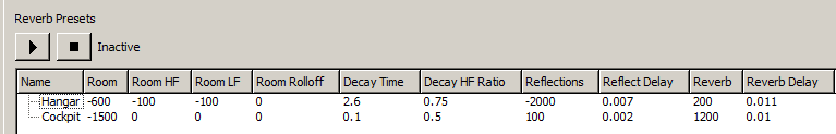 When opening the .fev file in FMOD Event Player, you can apply two reverb settings. One called “Hangar” and one called “Cockpit”. When these are applied in-game is self explanatory.