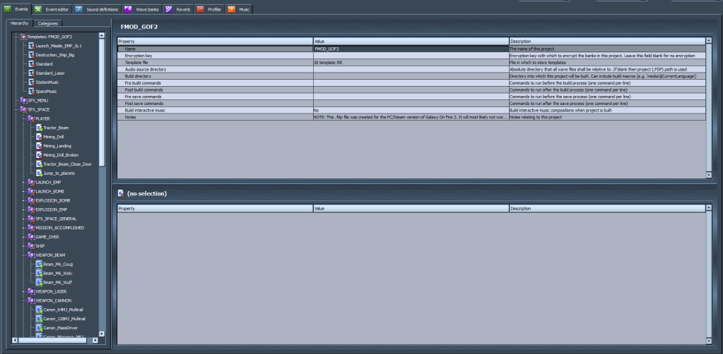 After a long break from modding, I finally released a new tool! I managed to recreate the FMOD Designer project file used for Galaxy On Fire 2 (GOF2) as close to the original as I could. The new tool can be found on my GitHub page and is designed to edit GOF2’s .fev file, which means it is now possible to easily and completely modify sound events. It is still far from perfect, as I have still not tested a lot of stuff, so I would appreciate any contributions to making it more and more like the original. With it, you can now add new sound effects and music without having to replace anything. Want to add more explosion sound effects or expand the soundtrack by making the game choose randomly between multiple possible battle tracks? All that is now possible! You can now change the behaviour of complex audio events such as the hangar atmosphere, mining process, engine effects, hangar music effects and much more. I’m very excited to see what mods will be made with this!